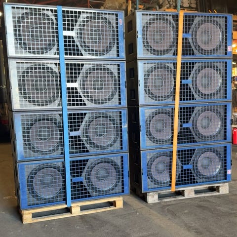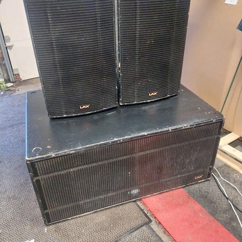 2 høytaler kasser uten delefilter å terminal men følger med 2 basselement å 2 diskant horn dette disse kassen var aktive en gang er 12 tommere