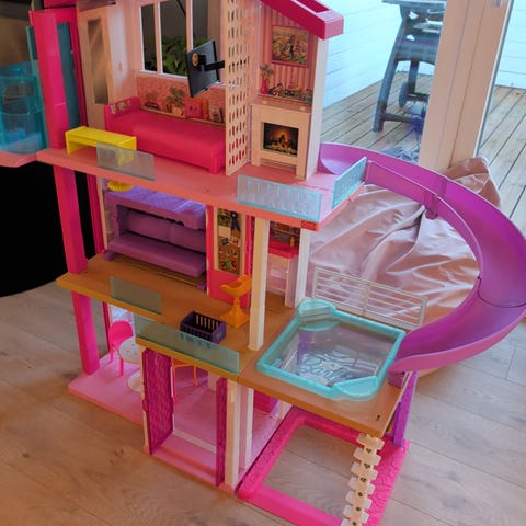 Barbie dukkehus med flere etasjer og rom, inkludert møbler og tilbehør. Dukkehuset har en rosa og turkis fargepalett og inneholder blant annet en sklie, seng, kjøkkenutstyr og diverse møbler. Passer for barn som liker rollelek med Barbie-dukker.
