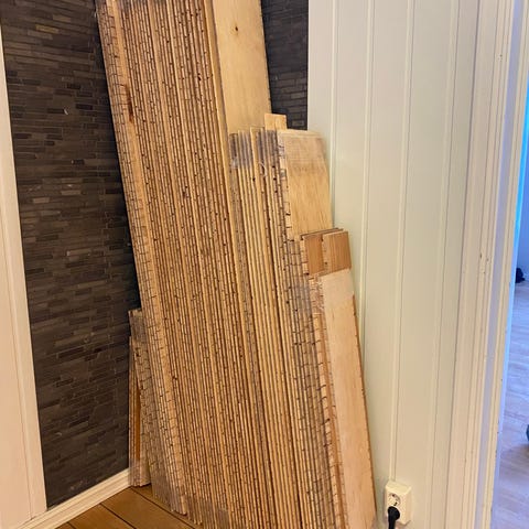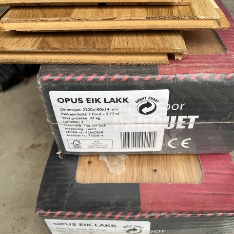 Brukt parkettgulv selges grunnet oppussing. Kvalitetsparkett. Er bruksmerker og riper i det noen steder, men stort sett pent brukt. Kan fint brukes igjen og sikkert også godt egnet til å slipe ned og lakke om ønskelig. Er ikke slipt ned fra før. Ca 60 kvm gulv har vi. Prisen er for alt gulvet.