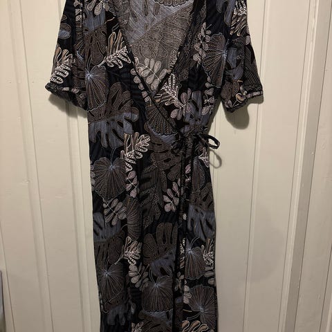 Flagrende omslagskjole, lengre bak. Iøyenfallende frisk fsrge