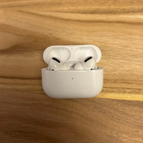 Vannskadet AirPods selges. Det er lyd i begge, men dårlig i den ene som også skifter sang og mellom støyreduksjon og lydfremheving selv.