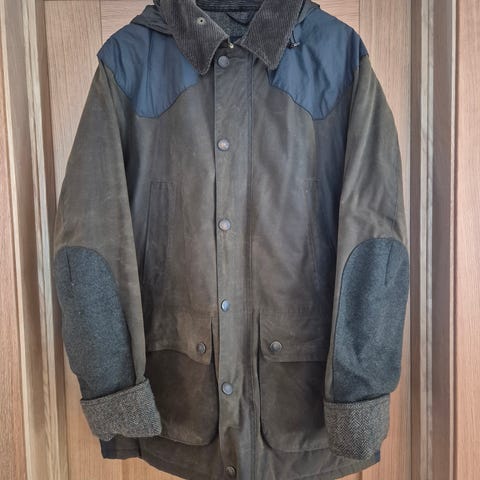 Pent og svært lite brukt Barbour-jakke laget i samarbeid med Land Rover Defender. Klassisk og solid modell i voksbehandlet bomull med detaljer i ull/tweed.
