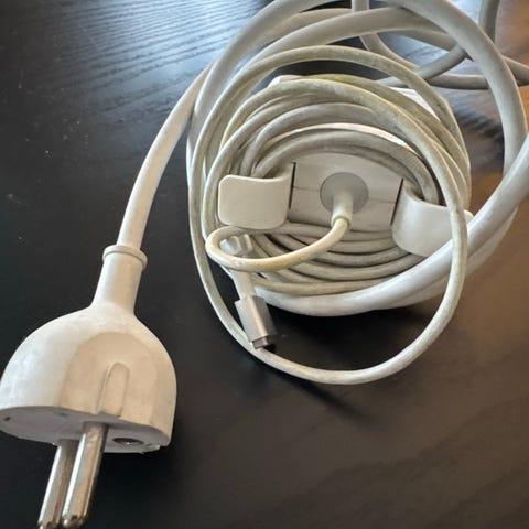 Apple MagSafe strømadapter for MacBook med hvit farge. Adapteren har en integrert kabel og europeisk støpsel. Designet for å gi strøm til kompatible MacBook-modeller.