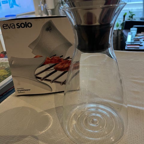 Rosendahl oppbevaringskrukke i klart glass med svart lokk som skrus på. Jeg har kastet esken så er usikker på om dette glasset tar 1,5L eller 2L oppbevaring, men høyden er i alle fall 24cm. Passer til oppbevaring av matvarer eller annet kjøkkenutstyr. Lite brukt.