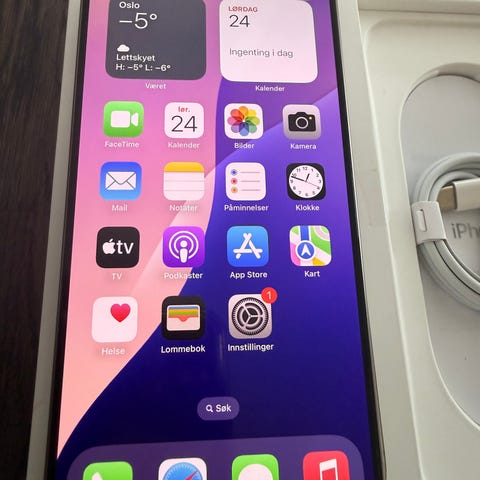Apple iPhone 14 med 128 GB lagringskapasitet i fargen midnight blue. Veldig pent brukt, alt fungerer som det skal! Følger med ladekabel, har også skjermbeskyttere og deksler som kan følge med.
