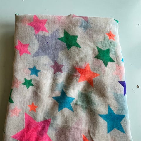 Halvparten av skjerfet har rosa stjerner, og den andre halvparten har oransje stjerner
