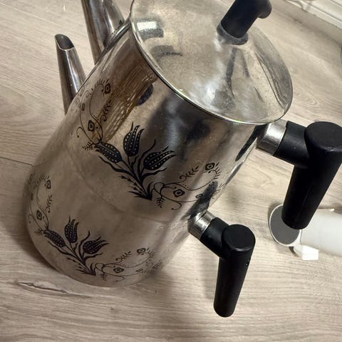 Arabia tekjele laget i rustfritt stål. Består av to deler som kan stables for effektiv bruk. Egnet for oppvarming av vann til te eller andre varme drikker.