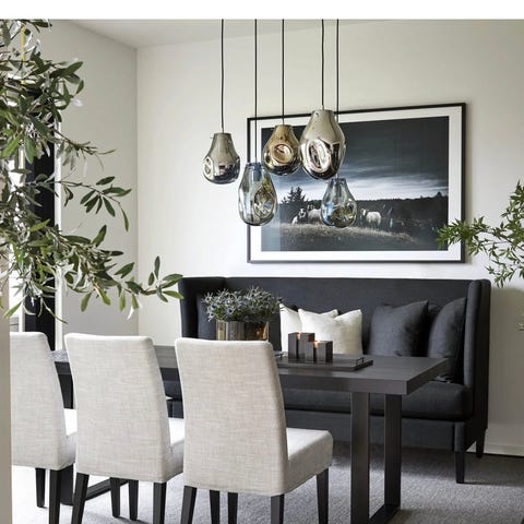 Selger et sort, pent brukt spisebord fra Slettvoll. Medfølger 6 mørk grå stoler, med endel bruksslitasje. 2 med armlener og 4 uten.