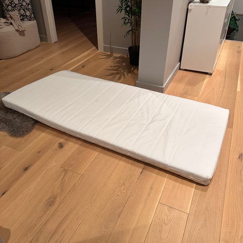 IKEA barneseng laget i hvitt tre. Sengen har en enkel design med spiler på sidene og en solid bakvegg. Den er egnet for små barn og kan brukes med en standard barnemadrass. Sengen har noen mindre bruksmerker på treverket.