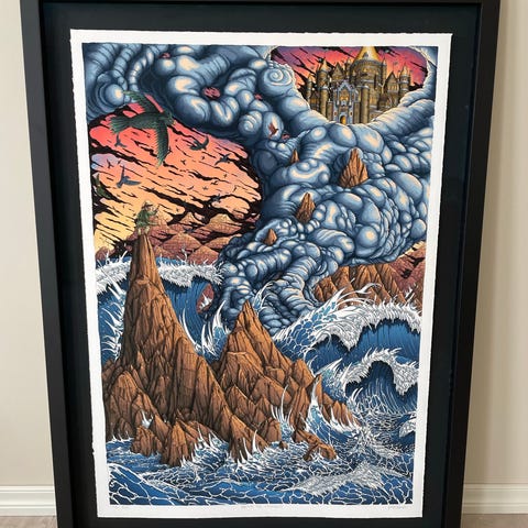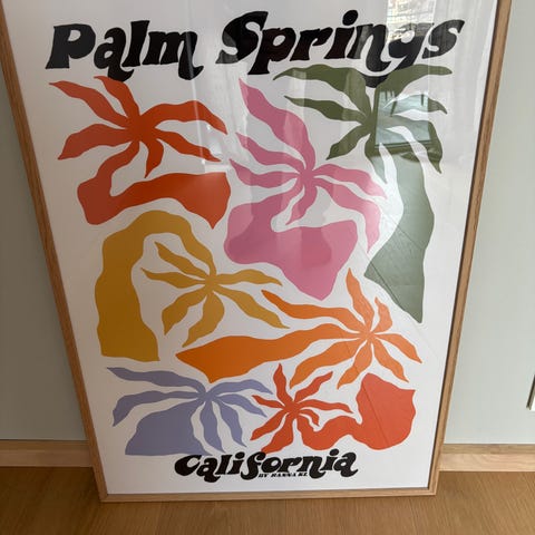 Plakat med illustrasjon som viser en bro over vann og to personer som fisker. Bildet har en fargepalett med blå, gule og grønne toner. Plakaten er innrammet og passer til veggdekorasjon.