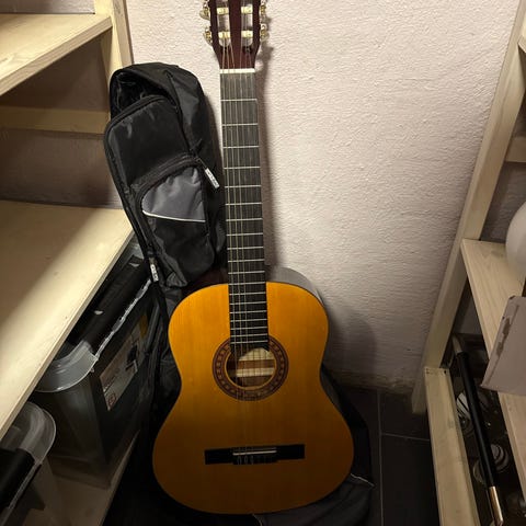 Morgan 1978 akustisk gitar i svart farge. Gitaren har klassisk design med seks strenger og er egnet for akustisk spilling. Eske og stativ følger med