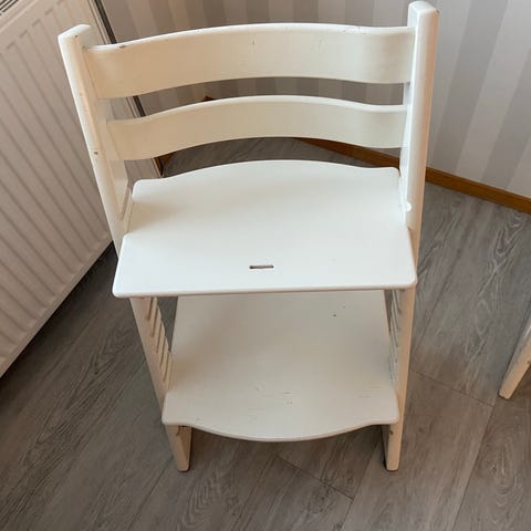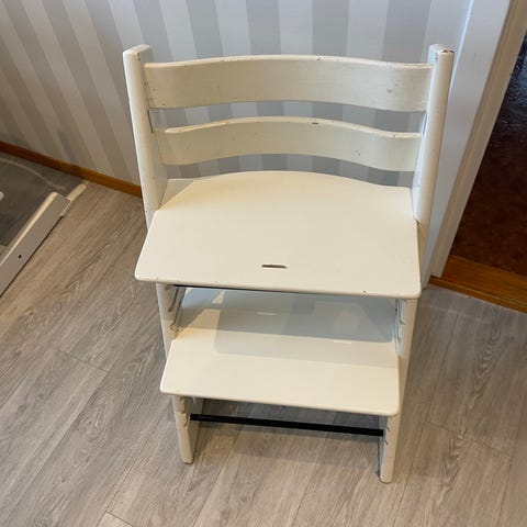 Stokke barnestol i grå farge. Stolen er designet for barn og har justerbar sitte- og fotplate for tilpasning etter barnets størrelse.