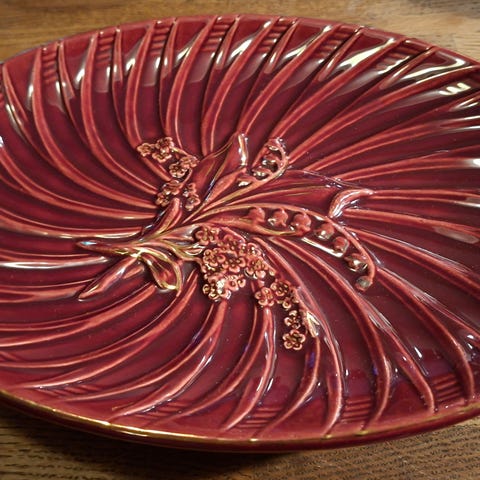 Har 6 vinglass i krystall i Bohemia stil med burgunderfarget klokke og blank stett.