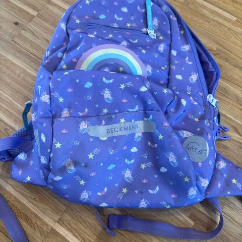 Søt Bergmann ryggsekk for barn med bl.a lilla farge og mønster av hjerter og ponni. Sekken har to innerlommer og to ytterlommer med glidelås og justerbare skulderstropper. Egnet for daglig bruk og barnehage.