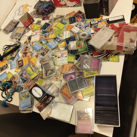 Pakke med Pokémon samlekort i forskjellige typer og farger. Kortene er organisert i permer med plastlommer,
