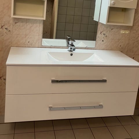 Pakke med baderomsinnredning inkludert vaskeservant, skap, toalettog sisterne.. Egnet for bad. Materiale og eksakte mål er ikke oppgitt. Det har stått som utstilling og aldri vært i bruk, annet at det har vært montert opp. Har ikke sett det montert, så det selges som det er.