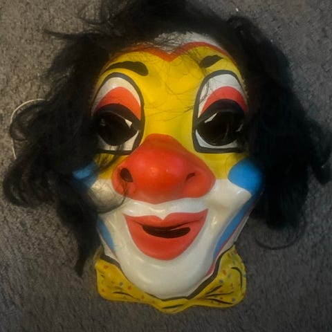 Maskerade maske i form av en sjømann som blunker og røyker pipe. Masken er laget i plast og har blå hatt med anker-symbol. Samleobjekt vintage retro