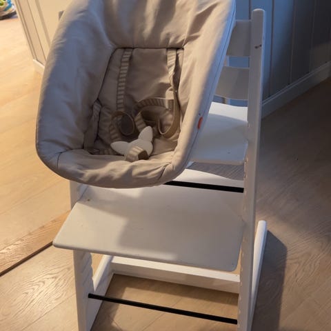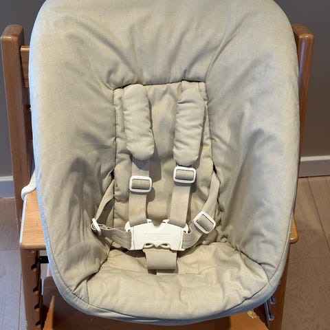 Newborn Set til Stokke stol, med trekk og sikkerhetssele. Settet inkluderer seteinnlegg, frontplate og trekk, designet for å gi støtte til nyfødte barn.