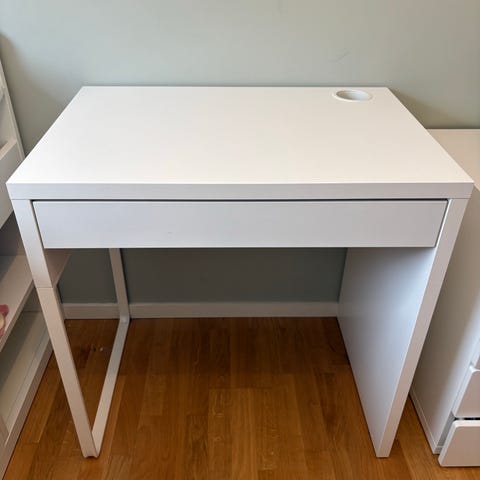 Svært lite brukt Micke skrivebord fra IKEA til salgs. Skrivebordet har en praktisk skuff og egen hylle til ledninger/ladere under bordplaten.