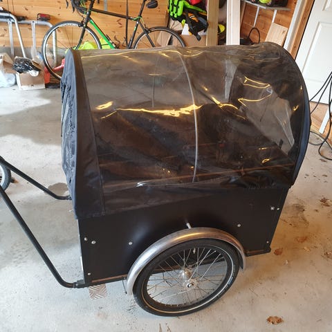 Kvalitetshenger. Brukt to små turer. Har ulike koblinger til bakhjulsnav som følger med. 26 og 28 tommer. Egen sykkelbag følger med.