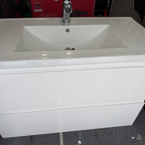 Gustavsberg servantskap med vask i hvit farge. Servantskapet har skapdører med håndtak i metall. Produktet er egnet for baderom og tilbyr oppbevaringsplass under vasken.