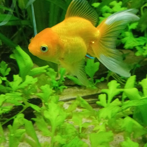 Vi hadde et slørhaledødsfall her i natt, og siden gullfisker trives best sammen ønsker vi å finne et nytt hjem til den vi har igjen.