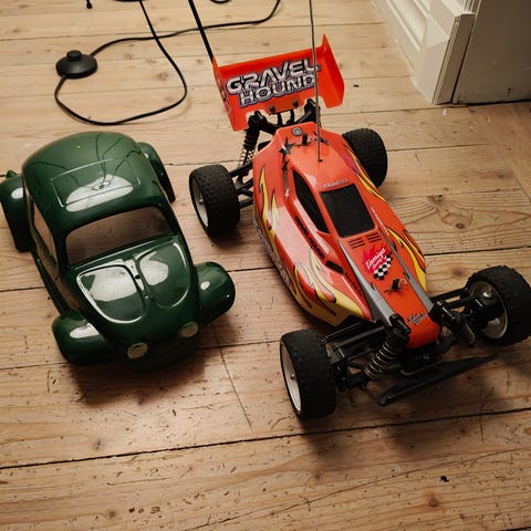 O.S. Max motor med tilhørende deler for radiostyrt modellbil. Inkluderer motor, drivverk, hjul med knotter, tennplugg og diverse komponenter. Egnet for bruk i modellbiler som krever denne typen motor og deler.