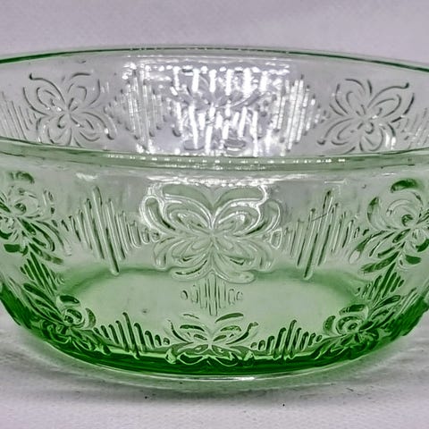 Vakker pressglasskål i klassisk Comet-mønster med stjerne- og rosettsliping. Klar og elegant utførelse med riflet kant og tre små føtter som gir et lett og dekorativt uttrykk. Typisk europeisk design fra midten av 1900-tallet.