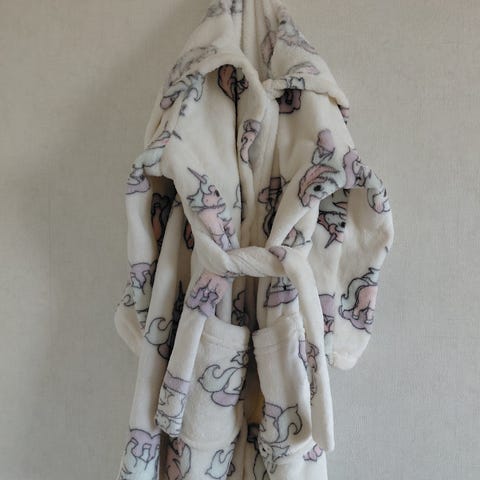 Badekåpe med enhjørning mønster i størrelse 122/128, 100% polyester.