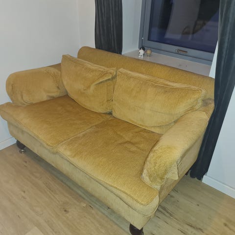 Sofa med beige trekk, 2-seter. Passer til oppholdsrom og stue. Har avtakbare puter og enkle, rette ben i mørkt tre. Nyrenset, vært i dyrefritt hjem. 1.etg