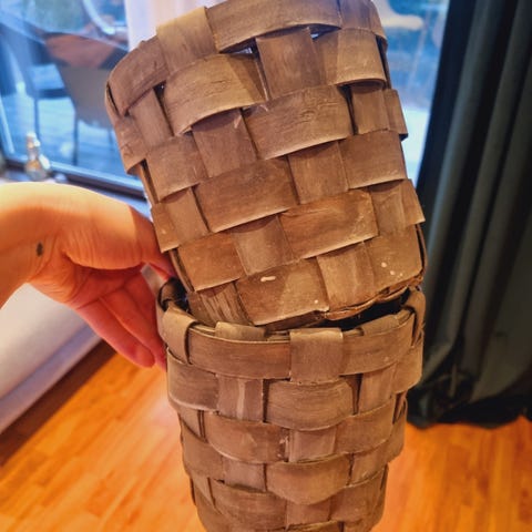 Lite brukt kurv/ vase med grønn/ blå tråd. Ikke beregnet til å ha vann i , men perfekt til kunstig / tørket planter. Lite og pent brukt.