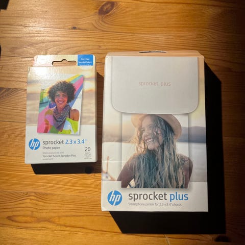 HP Sprocket fotoprinter i hvit farge. Kompakt og bærbar design for enkel utskrift av bilder direkte fra mobilen.