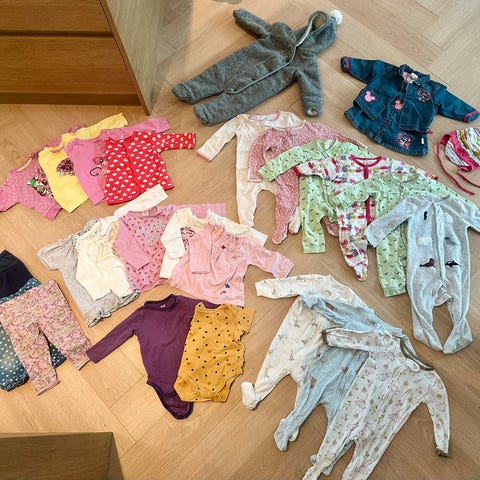 Klespakke for jente i størrelse 68 med flere plagg i ulike farger og mønstre. Inkluderer 6 bodyer og 1 heldress og 3 sett med body og bukse. Klær fra Reflex, Newbie, Wheat, Lindex og H&M.