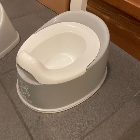Barnetoalett ring i plastmateriale med grå farge. Designet for barn med funksjonelle detaljer som gjør den enkel å bruke.