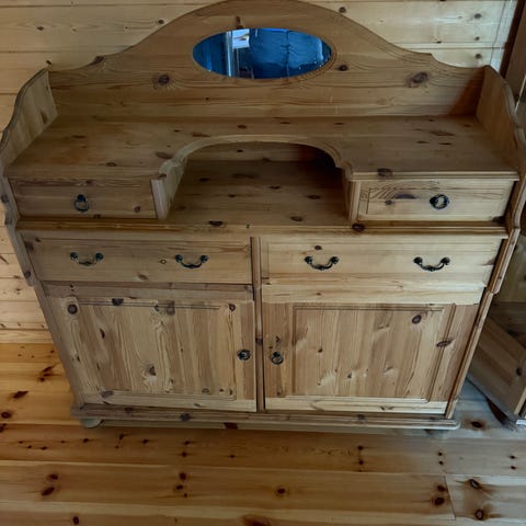 Syrebeiset og lakkert skjenk (uten innhold) og spisebord med 2 ileggsplater på 40 cm, samt 8 stoler selges, fortrinnsvis samlet. Ingen store skader, bare normal bruksslitasje .