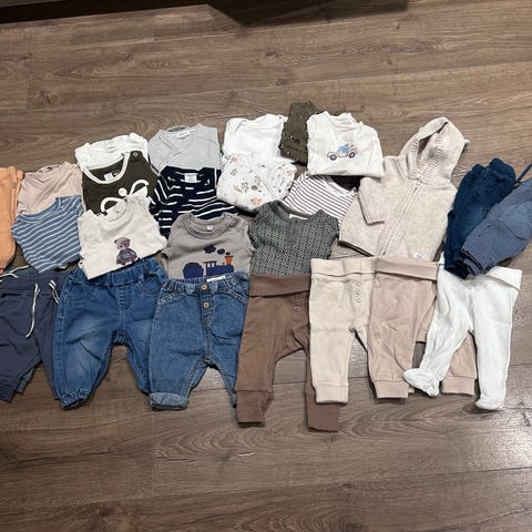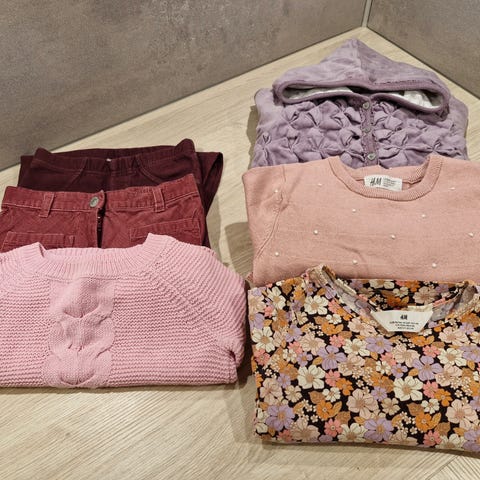 9 plagg selges samlet. De meste er lite og pent brukt. Noen flekker kan forekomme på et par av plaggene. En liten rift nederst på den ene olabukse. Se bilde.