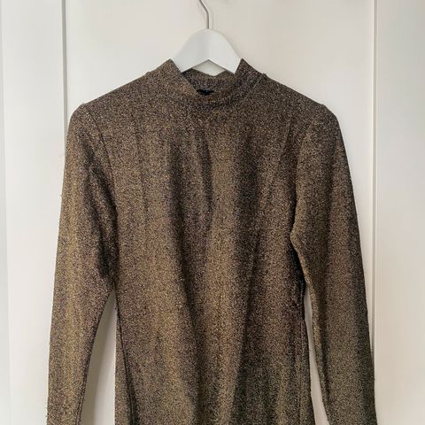 Denne slim-fit toppen fra Samsoe Samsoe har lange ermer og en polokrage. Den elastiske lurexjerseyen fremhever den strømlinjeformede silhuetten til denne skimrende lurextoppen. Perfekt til fest. str L men litt liten