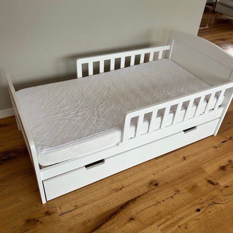 JLY Juniorseng i hvit farge. Sengen har en enkel design med sengehest på den ene siden og inkluderer en uttrekkbar skuff under for oppbevaring. Madrass medfølger, merket BabyMatex. Sengen er egnet for barn. Madrassen har en flekk som vist på bildet.