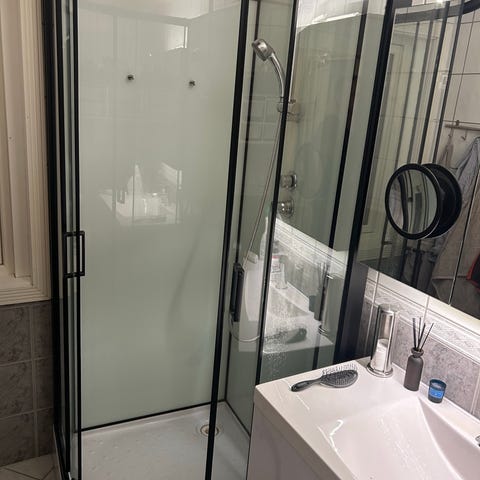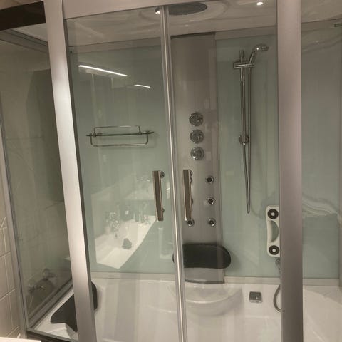 Dusjsett med hånddusj og termostatstyring i krom. Justerbar dusjstang med holder for hånddusj. Passer til standard baderom med flislagt vegg.