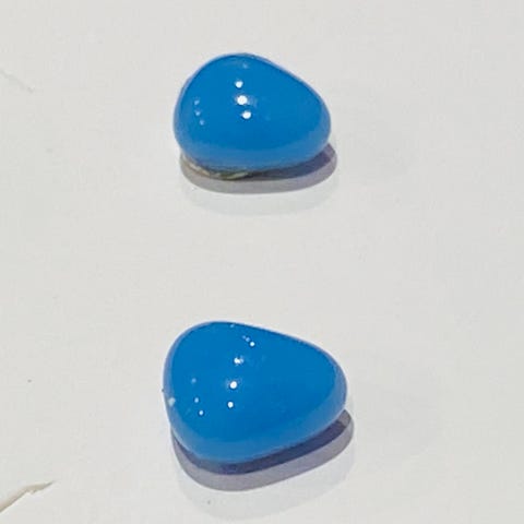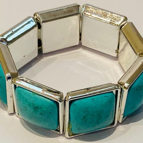 Halskjede med blå og hvite dekorative steiner festet til en kjede med sort flettet lærrem og metallås. Costume / bijouteri. Ikke ekte stener, men jeg tror reima kan være lær.