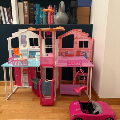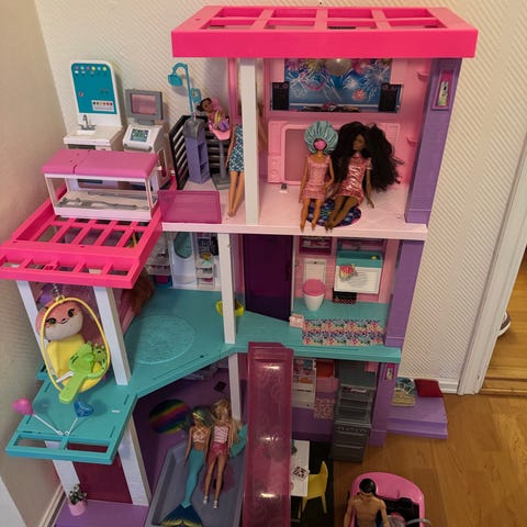 Barbie Malibu-dukkehus med flere rom og etasjer, inkludert ulike møbler og andre Barbie-effekter. Dukkehuset har farger i rosa, lilla og hvitt.