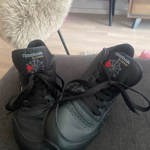 Reebok Classic hvite str. 38,5. brukt kun to ganger- som nye. Ekte skinn. Kjempegode og kule sko som passer til alt. Kjøpt for 1100.-. Lan sendes. Kjøper betaler frakt.
