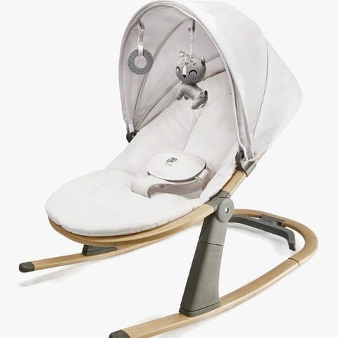 4moms vugge med digitalt kontrollpanel og Bluetooth. Designet for barn med sikkerhetssele og justerbare innstillinger for 6 forskjellige bevegelser og forskjellige lyder. Støtter også strømming av musikk via Bluetooth. (Ikke prøvd)