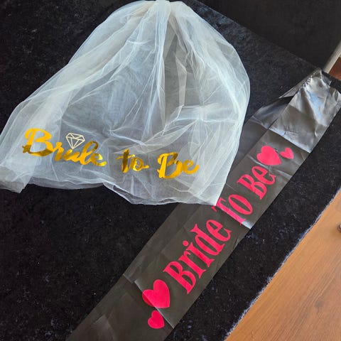 Bride to Be tilbehør for dame, inkludert slør med hårbøyle, hvite blomster dekorasjoner og hvit satengbånd med tekst "Bride to Be" i gull og rosa. Passer til bruk ved utdrikningslag eller bryllupsfeiringer.
