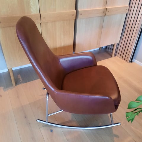 Stolen har en strømlinjeformet fasong og er utstyrt med støpte skumputer som gir god støtte, mens de buede bøylene i metall gir en behagelig gynging. Era Rocking Chair er en del av den prisbelønte Era-serien, kjent for sin tidløse estetikk og høye kvalitet.