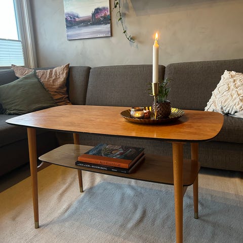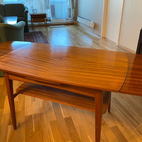 Bærer preg av levd tid og behov for olje. Ellers helt og stødig teakbord