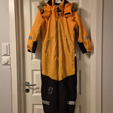 Brukt av ett barn i to sesonger. En liten flekk på venstre ermet (siste bildet), et lite hull ved venstre foten og antydning til slitasje på innsiden av beina (bildene 7-9), ellers er dressen hel og taler minst én sesong til.