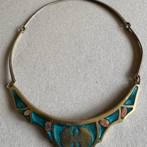Nydelig hals smykke i messing. 4 cm diameter. Lenka er 60 cm lang, altså 30 cm på hver side av hals..