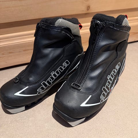 Alpina S F 11 skisko i størrelse 30, Laget med solide materialer som er angitt på innsiden av skoen. Skiskoene har glidelås foran og solide såler med godt grep.