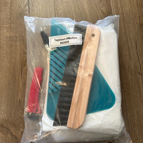 Selger splitter ny tapetset etter endret behov. Tapetsett i 4 deler til fibertapeter. Inneholder: rulle 18 cm, tapetsletter, tak- og sokkelkniv, samt 5 stk, industriskjæreblader.